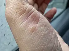 L'aspect est celui de placards rouges érythémateux couvert de boutons blancs, les pustules, localisés à la paumes des mains et parfois à la plante des pieds. Cette éruption est chronique mais peut disparaitre en laissant des taches brunes (des macules) ou parfois des desquamations.