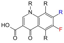 Structure de base des quinolones: le groupe R (bleu) est assez souvent un groupe pipérazine; si la molécule est liée à un fluor en position 6 (rouge), il s'agit d'une fluoroquinolone.