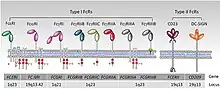 On distingue aussi les classes de FcR en fonction des cellules qui les expriment (macrophages, granulocytes, lymphocytes NK, lymphocytes B, cellules T et B) et des propriétés de signalisation de chaque récepteur[45].