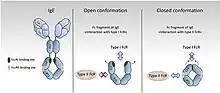 - Les récepteurs Fc de type I interagissent avec la conformation Ig Fc «ouverte», mais pas «fermée». Ces récepteurs comprennent FcγRI, FcγRII, FcγRIII, FcεRI, FcαRI, FcμR et Fcα / μR [36],[37],[38],[39]. En revanche, les FcR de type II se lient préférentiellement aux domaines Ig Fc en conformation «fermée». Parmi ceux-ci figurent des récepteurs de lectine de type C tels que FcεRII (CD23) et le récepteur DC-SIGN.