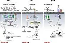 FcγRIIB1 et FcγRIIB2 présentent des séquences ITIM et sont des inhibiteurs des récepteurs Fc ; ils n'induisent pas de phagocytose. L'action inhibitrice de ces récepteurs est contrôlée par des enzymes qui éliminent les groupes de phosphates à partir de résidus de tyrosine; les phosphatases PTPN6 (en) et INPP5D (en) inhibent la signalisation par les récepteurs Fcγ[20]. La liaison du ligand à FcγRIIB conduit à la phosphorylation de la tyrosine du motif ITAM . Cette modification génère un site de liaison de la phosphatase, un domaine de reconnaissance SH2. L'arrêt du signal d'activation de l'ITAM est causé par l'inhibition des protéines tyrosine kinases de la famille Src, et par hydrolyse de la membrane PIP3, qui interrompt la signalisation aval par les récepteurs d'activation, telles que l'activation par FcγRs, TCR, BCR et les récepteurs de cytokines (par exemple, c-Kit)[21].