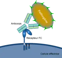 Les récepteurs Fc sur les cellules NK qui reconnaissent les IgG liées à la membrane d'une cellule-cible infectée par un agent pathogène sont appelées CD16 ou FcγRIII[27]. L'activation de FcγRIII par les IgG provoque la libération de cytokines telles que l'IFN-γ qui envoie des signaux à d'autres cellules immunitaires et médiateurs cytotoxiques comme la perforine et le granzyme, lesquelles entrent dans la cellule cible et déclenchent la mort cellulaire par apoptose. Ce processus est connu sous le nom de Cytotoxicité à médiation cellulaire dépendante des anticorps (ADCC). Les récepteurs FcγRIII présents sur les cellules NK peuvent également être associés avec des IgG monomères (c'est-à-dire des IgG non liées à des antigènes). Lorsque cela se produit, le récepteur Fc inhibe l'activité des lymphocytes NK[28].