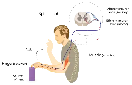 Une fois qu'un récepteur de danger (appelé "nocicepteur") a été stimulé, le signal voyage aussi via le nerf sensoriel jusqu'à la corne dorsale (postérieure) de la moelle épinière. Le nerf est connecté avec les motoneurones ipsilatéraux (du même côté) qui sortent de la corne ventrale (antérieure) de la moelle épinière et travaillent à éloigner la partie du corps exposée au danger dans un délai de 0,5 seconde[1]. Ainsi un motoneurone va inhiber le muscle extenseur du bras. La cellule en T a alors transmis deux messages à deux circuits interneurones, l’un excitateur qui excite le muscle fléchisseur ce qui conduit au retrait du bras devant la source de chaleur et l’autre inhibiteur qui inhibe le muscle extenseur.