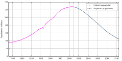 Le Japon connaît une baisse de population depuis plusieurs années[39]. Le gouvernement essaye d'encourager les femmes à avoir plus d'enfants ; beaucoup n'en ont pas et restent seules toute leur vie[40]. La population est aujourd'hui opposée à l'immigration, le gouvernement ne prévoit pas de politique en cette matière pour repeupler le pays[41].