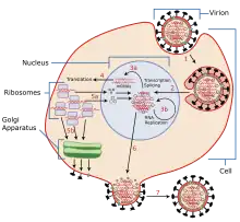 Chaque virus possède des modes de réplication bien particuliers, notamment selon qu'il s’agit d’un virus à ADN ou d’un virus à ARN. Les virus ne se multiplient que dans les cellules vivantes. La cellule hôte doit fournir l'énergie et la machinerie de synthèse ainsi que les précurseurs de faible poids moléculaire pour la synthèse des protéines virales et des acides nucléiques[2]. La réplication virale n'est présentée ici que dans ses grandes lignes et comprend sept étapes, qui sont :