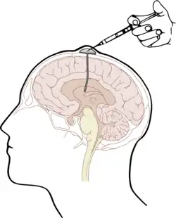 Image schématique montrant l'utilisation d'un réservoir Ommaya pour l'administration de médicaments par voie intrathécale.