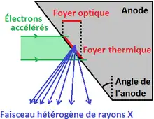 Les rayons X sont produits par un tube à rayons X. C'est un tube sous vide composé d'un filament chauffé alimenté par le courant continu de haute tension. L'intensité de ce courant (en mA) multipliée par le temps de pose (durée d'application du courant en s), sera directement lié au nombre de photons produits. En radiologie, ce paramètre correspond à la charge du tube en mAs. La haute tension est appliquée entre ce filament (cathode) et une cible (anode). Les électrons sont accélérés par cette tension et viennent bombarder l'anode. Celle-ci est composée d'un élément de fort numéro atomique afin de privilégier les interactions par rayonnement de freinage. Ces interactions électroniques produisent un spectre continu de rayons X dont l'énergie maximum correspond à l'énergie cinétique des électrons, donc à la tension appliquée. En médecine, on parle ainsi de kilovoltage (kV) pour qualifier le spectre en énergie des rayons X utilisés. Mais la plus grande part de l'énergie cinétique des électrons est convertie en chaleur au niveau du foyer thermique ce qui peut contribuer à le détériorer malgré le système de refroidissement. Pour cela, l'anode est souvent constituée d'un grand et d'un petit foyer. Le grand foyer a l'avantage de mieux dissiper la chaleur lors de clichés nécessitant beaucoup de mAs mais est à l'origine d'un plus grand flou géométrique au niveau de l'image. Tous ces paramètres sont réglables au niveau du pupitre de commande : kilovoltage, milliampères, temps de pose, taille du foyer. Un posemètre peut être placé en amont du détecteur de façon à asservir le temps de pose voire les milliampères. Il est réglé de façon que le détecteur reçoive la quantité optimale de photons, en prenant en compte les contraintes de radioprotection du patient.