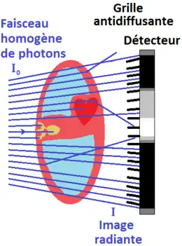 L'atténuation des photons en radiologie médicale provient essentiellement de deux types d'interactions : l'effet photoélectrique et la diffusion Compton. Lors d'une radiographie, en l'absence de diffusion Compton, les photons sont soit transmis à travers le patient soit absorbés par effet photoélectrique, en fonction des tissus traversés. Sur un grand nombre de photons incidents, le contraste de l'image est alors idéal. En pratique, certains photons sont diffusés par effet Compton, ils changent donc de trajectoire et peuvent ainsi interagir sur une zone du détecteur pour laquelle ils ne sont pas représentatifs des tissus traversés. Les photons diffusés diminuent donc la qualité de l'image. Pour pallier cette détérioration de l'image radiante, on utilise dans certaines conditions une grille antidiffusante ou la technique air-gap (voir plus bas : Qualité de l'image).