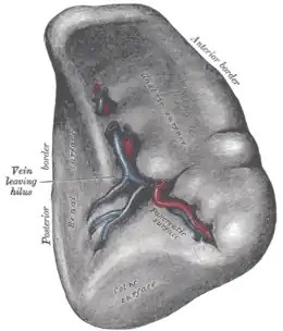 - la face médiale ou face gastrique se trouvant en regard de l'estomac. C'est sur celle-ci qu'est creusé le hile de la rate, région d'où entrent et sortent les vaisseaux ;