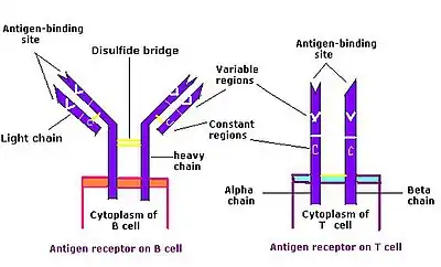 • Le récepteur des lymphocytes B est formé de 4 chaînes polypeptidiques : deux chaînes lourdes (H pour heavy), et deux chaînes légères (L pour light), qui sont reliées entre elles par un nombre variable de ponts disulfures assurant une flexibilité de la molécule. Pour une molécule donnée, les deux chaînes lourdes sont identiques, de même que les deux chaînes légères. Chaque chaîne légère est constituée d'un domaine « variable » et d'un domaine « constant » ; les chaînes lourdes sont composées d'un domaine « variable » et de trois ou quatre domaines « constants », selon l'isotype.