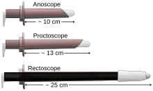Anoscope, proctoscope et rectoscope, avec leurs tailles approximatives.