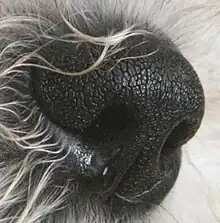 La surface externe du rhinarium contient de nombreux capteurs de pression et de température. L'évaporation forcée et rapide de la pellicule d'humidité sous l'effet du vent refroidit la surface de la truffe, ce froid étant perçu par les thermorécepteurs. Ces récepteurs donnent ainsi à l'animal la direction du vent[2].