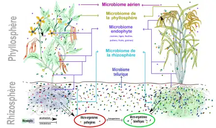 Au fil de l'histoire évolutive des végétaux, un réseau d'interactions extraordinairement complexe et diversifié s'est tissé entre les plantes et les micro-organismes. Cette évolution a conduit à la sélection de traits biologiques, notamment l'effet rhizosphère qui assure le recrutement de populations microbiennes (microbiote tellurique) ayant des activités favorables à la croissance et à la santé de la plante hôte, contribuant ainsi à son adaptation aux stress biotiques (attaque de pathogènes, compétition intraspécifique et interspécifique) et abiotiques (stress hydrique, carence en nutriments carbonés et minéraux)[9]. Ce recrutement spécifique est un processus dynamique qui évolue au cours du temps (développement végétal) et de l'espace (zones racinaires)[10].