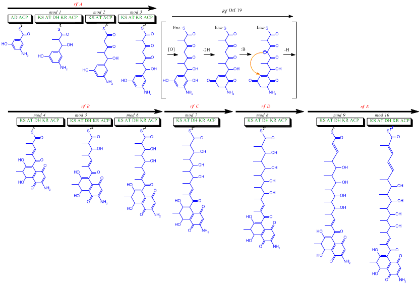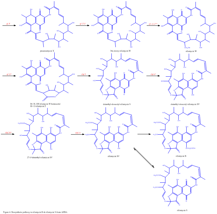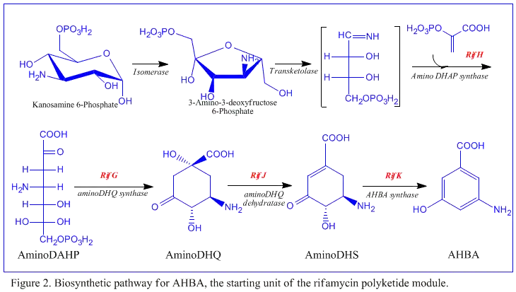 Bien que la rifamycine B soit un antibactérien doux, c'est le précurseur de plusieurs dérivés plus puissants utilisés en thérapeutique. La biosynthèse de cet antibiotique commence avec une amorce rare, l'acide 3-amino-5-hydroxybenzoïque (AHBA), sur une polycétide synthase de type I qui allonge la chaîne en utilisant deux unités acétate et huit unités propionate[5]. On pense que l'AHBA provient essentiellement du métabolisme du shikimate mais trois analogues d'acides aminés convertis en AHBA ont été observés dans les extraits cellulaires d’A. mediterranei[6].