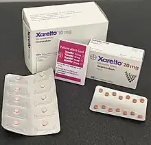 - ↑ (en) Kubitza D, Becka M, Voith B, Zuehlsdorf M, Wensing G, « Safety, pharmacodynamics, and pharmacokinetics of single doses of BAY 59-7939, an oral, direct factor Xa inhibitor », Clin Pharmacol Ther, 2005;78:412-21.