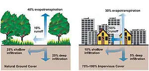 Les surfaces imperméabilisées, (routes, aires de stationnement et trottoirs) favorisent le ruissellement urbain. En effet, pendant les averses, orages et autres précipitations, ces surfaces (construites à partir de matériaux tels que l'asphalte et le béton) de même que les toits, au lieu de permettre à l'eau de s'infiltrer dans le sol conduisent les eaux pluviales et eaux pluviales d'orage polluées vers les égouts pluviaux[1]. Cela provoque un abaissement du niveau piézométrique (car la recharge des aquifères est réduite) et des inondations puisque la quantité d'eau qui reste à la surface est plus importante[2],[3]. La plupart des réseaux d'égouts pluviaux municipaux rejettent des eaux pluviales non traitées dans les cours d'eau, les rivières et les baies. Cet excès d'eau peut également faire son chemin dans les propriétés des gens par refoulement des égouts et par infiltration à travers les murs et planchers des bâtiments.