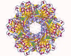 - KaiC forme un hexamère qui ressemble à un beignet double avec un pore central partiellement fermé à une extrémité[33]. Il y a douze site ligants (ponts chimiques) pour l'ATP - dans KaiC.