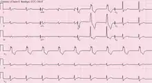 Les complexes QRS sont larges, avec un aspect de « tachycardie ventriculaire lente » et dissocié des ondes P.