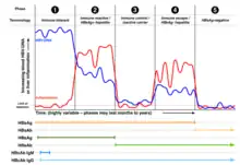 Les étapes générales de la séroconversion pour l'hépatite B, où la ligne de détectabilité indique la séropositivité