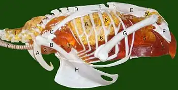 Les poumons des oiseaux sont ventilés par des organes appelés les sacs aériens antérieurs et postérieurs[2],[3]. Les sacs aériens ne jouent pas de rôle dans les échanges gazeux mais contribuent à apporter un volume fixe d’air frais[2]. Grâce aux sacs aériens, l'air traverse les poumons de façon continue indépendamment des mouvements d'inspiration et d'expiration[3]. Grâce à ce systèmes de poches d'air, l'apport d'oxygène dans le sang est continu[3].