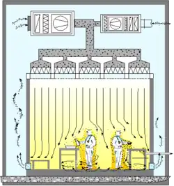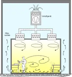 Un flux constant d'air sain du plafond accule l'air contaminé au sol loin du patient et de la région opératoire[1]. C'est encore plus important pour la chirurgie orthopédique, parce qu'ici un traitement préventif d'antibiotique n'aide pas l’asepsie.