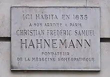 Le , Hahnemann, à l’occasion d’une consultation, en , fait la connaissance de Mélanie d’Hervilly-Gohier, ils se marient à Köthen, qu'ils quittent, le , pour arriver à Paris, le . En août, Hahnemann obtient l’autorisation d’y exercer l’homéopathie (rue Madame, puis rue des Saints-Pères et enfin rue de Milan). Une cinquantaine de médecins exercent déjà l’homéopathie à Paris[8]. Médecin respecté et beaucoup occupé, Hahnemann passa ses huit dernières années à Paris. Déjà en 1837, un de ses malades célèbres est le violoniste Niccolò Paganini , qui souffrait de toux, rétention d'urine et priapisme. Le traitement se termine à la suite du rejet de ses offres à Mme Hahnemann. Fin 1838, il guérit la fille du célèbre écrivain et académicien Ernest Legouvé, qui était déclarée irrémédiablement perdue par ses médecins. On fait venir le peintre Amaury-Duval pour conserver au moins un souvenir d'elle. Son travail terminé, il leur dit : « Mais enfin, puisque votre médecin déclare votre enfant perdue, pourquoi ne vous adressez-vous pas à cette médecine nouvelle qui commence à faire tant de bruit dans Paris ; pourquoi n’irez-vous pas trouver Hahnemann ? » - « Cette guérison fut un événement dans Paris, presque une sorte de scandale »[9],[10]. Ainsi « sa réputation devenait de la gloire » dans la société parisienne et lui amenait d'autres malades bien connus, comme l'écrivain Eugène Sue[11] ou la mère de Victor Schœlcher. Les dossiers médicaux encore existants de la période de Paris n'ont été que partiellement évalués et pourraient offrir d'autres surprises[12].