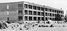 Cela permet de construire les imposantes installations qui sont inaugurées en juin 1930 avec l'achèvement de l'annexe Est construite à l'épreuve du feu[18]. Vers 1926 l'annexe Ouest, qui deviendra la partie nord de la Ruche, est déplacée pour la construction de l'annexe Sainte-Hélène. Vers 1928 l'annexe Est, qui deviendra l'infirmerie, est déplacée pour faire place à la construction en brique de l'annexe Couillard . On construit la centrale thermique[19] avec sa haute cheminée; ses chaudières à vapeur sont d'abord alimentées au charbon puis, au cours des ans, à l'huile et au bois (période de la base de plein air). Le nouveau château d'eau est alimenté en eau par une pompe à vapeur à partir d'une conduite d'eau souterraine de 6" de diamètre se rendant au lac. L'eau potable provient du puits qui alimentait l'ancien château d'eau. Des tunnels servent à distribuer la vapeur aux divers bâtiments; entre la résidence des sœurs et le sanatorium, ils sont de taille suffisante pour être utilisés par les employés durant les rigoureux hivers où la température chute couramment sous les moins quarante degrés Celsius. Une turbine à vapeur actionne une génératrice électrique à courant continu. En 1950, l'installation dans la centrale thermique de deux nouveaux groupes électrogènes à deux moteurs diesel chacun (utilisés en alternance) permet la transformation au courant alternatif ainsi que l'alimentation électrique du village, jusqu'à la prolongation du réseau d'Hydro Québec en 1967-1968[20]. Une photo vers 1935 de la façade nord montre un bâtiment bas (probablement la cuisine) ajouté à l'aile nord-est du Centre qui est prolongé par une aile ouest (probablement l'aile Ste-Thérèse) pour rejoindre l'imposante annexe Ste-Hélène; la chapelle est reliée à l'aile "Ste-Thérèse" qui intègre un clocher.