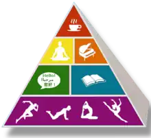 « Pyramide des besoins mentaux », incluant l'activité physique, la lecture, l'apprentissage de langues étrangères, la méditation, la pratique de la musique et l'entraînement cognitif[note 1].