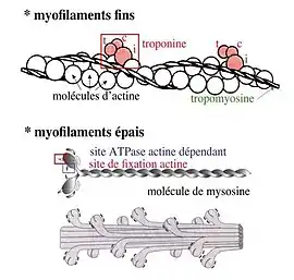 - Lorsque la cellule musculaire striée squelettique est stimulée par un motoneurone (via le neurotransmetteur acétylcholine), il y a activation de canaux calciques voltage-dépendants, ce qui provoque l'entrée de calcium dans la cellule. On a également sortie de calcium du réticulum sarcoplasmique (la forme musculaire du réticulum endoplasmique). Ce calcium vient se fixer sur la troponine ce qui provoque un changement de conformation de cette dernière, libérant le domaine d'interaction de la myosine. Au terme de cette étape la myosine est fixée à l'actine.