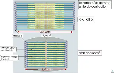 C'est ainsi que des milliers de têtes de myosine réalisant ce cycle parviennent à raccourcir la taille du sarcomère de 3,4 µm (forme étirée) à 2,4 µm (forme contractée).