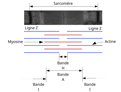 Les sarcomères sont les agents responsables de l'apparence striée des muscles des membres squelettiques et cardiaques. On définit un sarcomère comme étant le segment entre deux lignes-Z voisines. Dans les coupes longitudinales des muscles en microscopie électronique, les lignes-Z (de l'allemand zwischen, signifiant "entre") apparaissent comme une série de lignes foncées. À côté de la ligne-Z, on retrouve la bande-I (pour isotropique). La bande-A (pour anisotropique) vient ensuite. On retrouve une partie plus pâle dans cette région appelée la zone H (de l'allemand heller, plus pâle). Finalement incluse dans cette dernière, la mince ligne-M (de l'allemand mittel, centre) se situe à l'intérieur. Les bandes A et I ont été nommées d'après leurs propriétés sous microscope polarisant. Les bandes A et I, ainsi que la ligne Z, sont visibles au microscope optique.