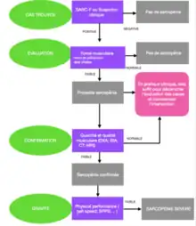 En 2010, le groupe de travail européen sur la sarcopénie des populations âgées (European Working Group on Sarcopenia in Older People) a donné une première définition et un schéma de diagnostic de la sarcopénie. Depuis 2019, il propose une adaptation de ce schéma (figure 1), basée sur les caractéristiques cliniques associées à la sarcopénie.