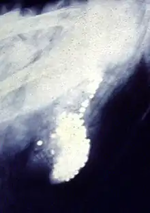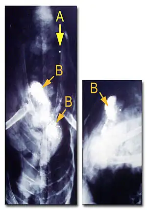- Le diagnostic est confirmé chez un oiseau mort si son foie contient 6-8 ppm ou plus de plomb (poids humide) et/ou que de la grenaille de plomb est trouvée dans le gésier (l'observation aux rayons X est alors préférable pour distinguer le plomb des graviers). L'absence de billes de plomb dans le gésier ne signifie pas qu'un oiseau n'est pas mort de saturnisme, car les billes de plomb se dissolvent totalement après quelques dizaines d'heures[56] ;