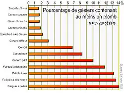 - Le faisan lui-même est concerné, bien que massivement et couramment réintroduit dans la nature à partir d'élevages[41] et souvent agrainés. Ainsi a-t-on analysé 437 faisans à collier tués sur 32 domaines les printemps 1996 et 1997 et lors des périodes de 1999-2000 et 2001-2002. Et le plomb a aussi été dosé dans l'os alaire (de l'aile) de 98 poules faisanes collectées en 1997. 3,0 % des gésiers contenaient au moins un plomb[41]. Ce taux d'ingestion n'a pas varié selon les années, les saisons ni selon le sexe. Les mâles avaient des taux de plomb osseux variant de 7 à 445 ppm (moy= 48,8 ± 8,8) en poids sec[41]. Les auteurs de cette étude suggèrent aux responsables et gestionnaires de ball-trapp et de zones d'entrainement au tir de prendre conscience que l'ingestion de grenaille concerne aussi les faisans, et qu'il faut peut-être localement envisager des mesures pour réduire l'exposition de la faune sauvage au plomb[41].