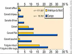- Dès les années 1970, on s'inquiète du problème en Europe du Nord, dont au Danemark[43]. On mesure des densités de 399 billes de plomb/m2 [20] dans les 30 premiers centimètres de sédiments à proximité des huttes ou dans les zones fortement chassées. Le canard colvert (Anas platyrhynchos) est souvent étudié, car commun, facile à identifier, élever et à repérer[20]. À la fin des années 1980, la prévalence observée d'ingestion de grenaille de plomb varie de 2 % à 10 % des colverts européens, mais Déborah Pain montre en camargue, que les oiseaux atteints de saturnisme se cachent soigneusement pour mourir et que moins de 10 % d'oiseaux morts et non cachés sont retrouvés, même quand on les cherche activement, dans un lieu que l'on connait déjà[32],[44]. Ils échappent donc aux statistiques. Dans les deltas méditerranéens, 25 à 45 % des sujets ont des billes de plomb dans le gésier[20]. Le canard pilet (Anas acuta) et le fuligule milouin (Aythya ferina), sont les plus touchés avec 60 à 70 % des gésiers contenant un plomb ou plus[20] ;