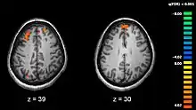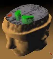 - Les gènes NOTCH4, NRG1 ou DTNBP1[29] : le gène DTNBP1 est un des gènes les plus susceptibles d'expliquer des cas de schizophrénies avec des résultats concordants plusieurs fois répliqués[69],[70],[71],[72],[73]. Les changements d'allèles de deux marqueurs de polymorphisme nucléotidique simple Rs1018381 et Rs2619522 sur le gène DTNBP1 impactent tous deux le volume de matière grise dans des régions du cerveau bien spécifiques[74]. On a pu révéler par IRM[75] que les porteurs de l'allèle G sur rs2619522 exhibaient un volume plus élevé de matière grise dans l'hippocampe, le cortex frontal et pariétal. Les porteurs de l'allèle T de rs1018381 possédaient une augmentation de volume dans les régions du lobule lingual et du thalamus. Les auteurs ont noté l'effet contre-intuitif de l'augmentation du volume de l'hippocampe, contraire à la réduction habituellement observée pour d'autres cas de schizophrénies. Environ 25 % des Européens possèdent l'allèle G du marqueur rs2619522 et environ 5 % sont homozygotes GG[76]. Quant à Rs1018381, environ 15 % des Européens possèdent l'allèle T et moins d'1 % sont homozygotes TT[77], ce qui prouve une faible sélection naturelle de ces génotypes dans cette population. Les individus portant un seul allèle à risque à la fois sur Rs1018381 et Rs2619522 posséderaient un endophénotype cérébral compromis particulièrement vulnérable pour développer un plus grand risque de schizophrénie.