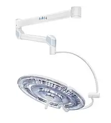 Orientable et composé de nombreuses sources de lumière et de miroirs, il présente la particularité de diffuser une lumière blanche (pour mieux distinguer les tissus et organes), uniforme et sans ombres portées. Il est venu remplacer les anciens éclairages de salles d'opération, auparavant éclairées par de simples plafonniers[2].