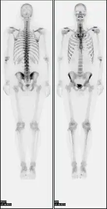 La scintigraphie osseuse est un examen de médecine nucléaire consistant à injecter à un patient un produit radioactif qui va se fixer sur le squelette. Cet examen permet d’obtenir des images qui sont le reflet du métabolisme osseux. Il est indiqué dans de nombreuses pathologies osseuses, notamment en cancérologie pour la recherche de métastases osseuses ou en rhumatologie[1].