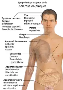 - Une asthénie (fatigue), symptôme fréquent de la sclérose en plaques et qui est considéré par près de 55 % des patients comme étant le symptôme le plus invalidant[29].