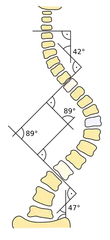 Le principal critère d'évaluation de la scoliose est l'« angle de Cobb », qui se mesure sur une radiographie du rachis de face. C'est l'angle formé à partir de l'intersection de deux droites tangentielles l'une au plateau supérieur de la vertèbre limite supérieure, l'autre au plateau inférieur de la vertèbre limite inférieure. Les conventions médicales veulent qu'un angle inférieur à 10 degrés ne soit pas considéré comme une scoliose à part entière[35]. On peut classer les courbures scoliotiques en fonction de leur importance :