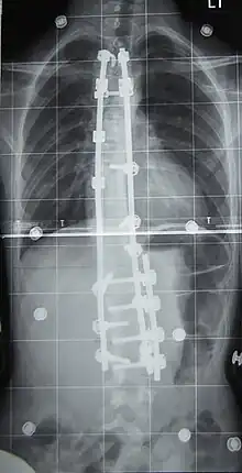 L'indication concerne environ 10 % des scolioses idiopathiques du sujet jeune[2] et concerne les scolioses importantes, avec un angle de Cobb dépassant les 50°. La technique consiste en la mise en place de deux longues tiges métalliques vissées dans les vertèbres, permettant le redressement de la colonne vertébrale, notamment avec la technique et le matériel de 3e génération proposés par Cotrel et Dubousset[45]. Les complications sont essentiellement locales mais il peut exister des étirements ou compressions de racines nerveuses dans moins d'un pour cent des interventions[46].