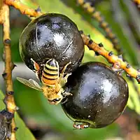 • Fruits : drupes globuleuses-ellipsoïdes, vertes puis orange et enfin noires à maturité. 1,6 - 2,5 cm long, 1,2 - 1,9 cm de diamètre. Elles mûrissent pendant la saison des pluies.