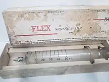 - Vers 1970[6] : les frères Louis Nogier et Paul Nogier, médecins lyonnais, inventent la seringue en plastique ( "joint pour seringue en matière plastique utilisée une seule fois"[7], en 1959, "seringue robuste en matière plastique destinée plus particulièrement à l'usage vétérinaire ou dentaire"[6], en 1967), avec aiguille à usage unique, puis de la seringue entièrement à usage unique. Au fil du temps ils l'amélioreront. L'apparition de cette seringue jetable en médecine est une révolution et est devenue indispensable car elle est peu coûteuse et elle permet d'éviter la transmission de micro-organismes (dans le cas où l'aiguille est infectée). Leurs tailles sont variables. Ils innoveront par la suite le joint en plastique.