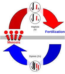 Les traits génétiques sont encodés dans l'acide désoxyribonucléique (ADN) des chromosomes. La cellule eucaryote possède un ensemble de chromosomes homologues par paire, un de chaque parent, et cette étape à double chromosome est appelée "diploïde". Pendant la reproduction sexuée, un organisme diploïde produit des cellules sexuelles spécialisées haploïdes appelées gamètes via la méiose[4], chacune ayant un seul ensemble de chromosomes. La méiose implique une étape de recombinaison génétique via un croisement chromosomique, au cours de laquelle des régions d'ADN sont échangées entre des paires de chromosomes appariés, pour former de nouveaux chromosomes, chacun avec une nouvelle combinaison des gènes des parents. Ensuite, les chromosomes sont séparés en ensembles simples dans les gamètes. Dans la progéniture, chaque gamète a ainsi la moitié du matériel génétique de la mère et la moitié du père[5]. La combinaison du croisement chromosomique et de la fécondation, qui réunit les deux ensembles simples de chromosomes pour former un nouveau zygote diploïde, donne naissance à un nouvel organisme qui contient un ensemble différent des traits génétiques de chaque parent[réf. souhaitée].