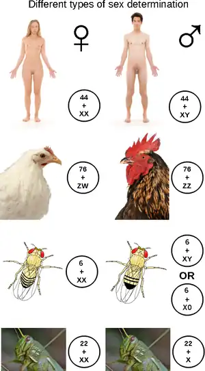 La cause biologique du développement d'un organisme dans l'un ou l'autre sexe est appelée détermination du sexe. La cause peut être génétique, environnementale, haplodiploïde, ou multiple[11]. Chez les animaux et les autres organismes qui ont des systèmes génétiques de détermination du sexe, le facteur déterminant peut être la présence d'un chromosome sexuel. Chez les plantes sexuellement dimorphes, comme le Ginkgo biloba[27], l'hépatique Marchantia polymorpha ou les espèces dioïques du genre de plantes à fleurs Silène, le sexe peut également être déterminé par les chromosomes sexuels[28]. Les systèmes non génétiques peuvent utiliser des indices environnementaux, comme la température au début du développement chez les crocodiles, pour déterminer le sexe de la progéniture[29].