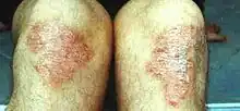 Le grattage du foyer psoriasique entraîne le détachement de squames normalement sous forme de pellicules blanches. Une abrasion plus forte élimine la totalité des squames, mettant au jour une peau mince, luisante et vaguement transparente, correspondant aux dernières couches de l'épiderme, et fait apparaître sur la zone desquamée, des petits points de saignement dénommés signes de la rosée sanglante ou signe d'Auspitz[2].