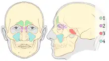 Représentation des sinus paranasaux : en vert (1) les sinus frontaux, en violet (2) les sinus ethmoïdaux, en rouge (3) les sinus sphénoïdaux et en bleu (4) les sinus maxillaires.