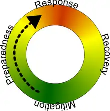 Les services de secours appliquent divers protocoles face à une situation d'urgence ; ces procédures commencent par la préparation d'un plan d'urgence en amont d'un éventuel évènement. Un système courant pour illustrer ces phases et le graphique ci-contre.