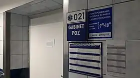 La base du système de soins de santé est le médecin de premier recours, qui est le plus souvent un spécialiste de la santé familiale. Ils sont responsables de la conduite du traitement et de la prise d'actions préventives pour les patients assignés. Si la maladie nécessite l'intervention d'un spécialiste, le premier médecin de référence oriente vers un hôpital ou une autre unité de soins. Les cabinets de soins primaires sont ouverts du lundi au vendredi à partir de 8h00 du matin à 6h00 pm À d'autres moments, le Narodowy Fundusz Zdrowia a des contrats avec des unités de services médicaux 24 heures sur 24. Les adresses et les numéros de téléphone des unités offrant un service médical 24 heures sur 24 sont disponibles dans les cabinets médicaux primaires. Une référence n'est pas nécessaire pour l'oncologie, la gynécologie, la psychiatrie, la dentisterie ou les maladies sexuellement transmissibles. Tous les soins dentaires ne sont pas couverts par le régime d'assurance maladie[7].