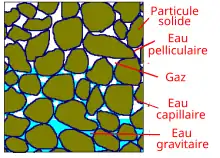 La fraction liquide est constituée d'eau et d'éléments dissous. L'eau est sous trois états dans le sol : l'eau gravitaire (dite aussi eau de saturation, eau de percolation ou eau libre) qui circule dans la macroporosité, l'eau capillaire (dite aussi eau pendulaire) qui occupe essentiellement la mésoporosité et l'eau pelliculaire (dite aussi eau liée) qui occupe la microporosité[50].